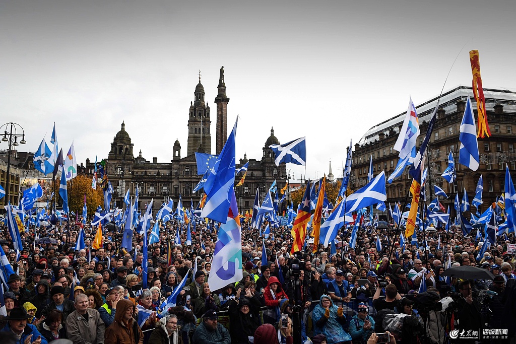 當地時間2019年11月2日,英國蘇格蘭格拉斯哥,數千人在英國蘇格蘭最大城市格拉斯哥舉行集會,要求讓蘇格蘭成為獨立國家。蘇格蘭首席大臣、蘇格蘭民族黨(SNP)黨魁斯特金(Nicola Sturgeon)發表講話稱,獨立目標已“近在咫尺”。