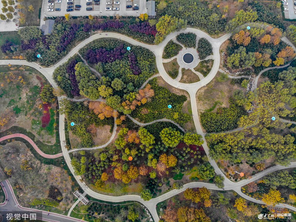 2019年11月9日,航拍山東東營植物園,秋意漸濃,五顏六色的植被像五彩的畫卷鋪展在廣袤的大地上。