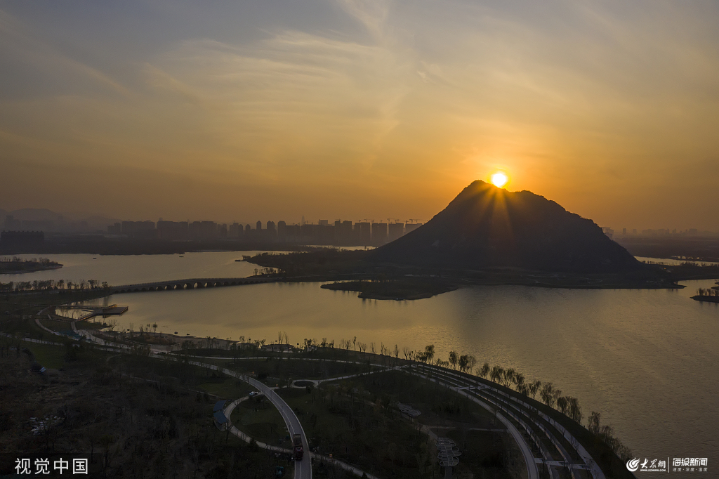 2019年11月28日,濟南,冬日暖陽下的華山新景區(qū),被金色落日染得一片金黃。