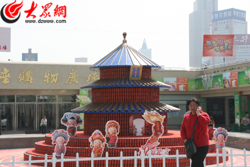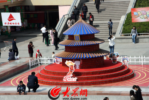 大眾網(wǎng)濟(jì)南4月24日訊 北京奧運(yùn)開(kāi)幕在即,奧運(yùn)也成了商家促銷的熱門主題。圖為在濟(jì)南某大型超市門口,商家用飲料罐搭成“天壇”模型,祝福北京奧運(yùn),吸引了很多市民的目光。(記者 趙永剛 攝影報(bào)道)