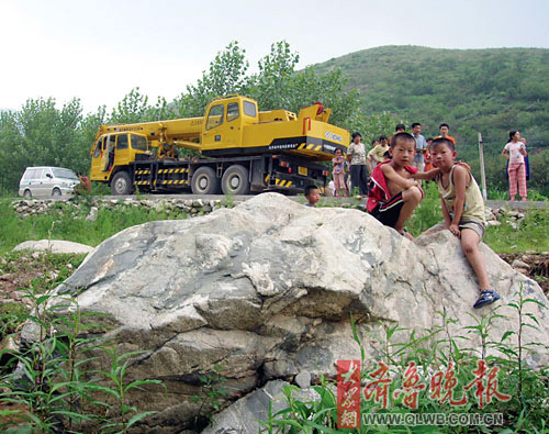 本報(bào)濟(jì)南7月11日訊 11日凌晨3時(shí)許,一輛小汽車(chē)和一輛大吊車(chē),悄悄來(lái)到省城歷城區(qū)西營(yíng)鎮(zhèn)上降甘村,想將路邊河溝里的一塊大石頭吊走。然而,剛把鋼絲繩捆上石頭,就被村民發(fā)現(xiàn),隨即報(bào)警稱有人偷他們村的“寶石”。 11日上午,記者來(lái)到西營(yíng)鎮(zhèn)上降甘村,發(fā)現(xiàn)路邊上停放著一輛小轎車(chē)和一輛嶄新的大吊車(chē),車(chē)旁邊圍滿了村民。 路邊的河溝里,有一塊長(zhǎng)約3米、高約1米的大石頭,這塊石頭其他地方看上去與普通石頭沒(méi)有什么區(qū)別,其中一面的花紋像一條龍(左圖)。 村民說(shuō),曾經(jīng)有一位專門(mén)收購(gòu)石頭的專家鑒定過(guò),稱這塊石頭很有價(jià)值,曾經(jīng)有人出價(jià)30萬(wàn)想買(mǎi)這塊石頭,但是他們沒(méi)有答應(yīng)。 村民李先生告訴記者,11日凌晨3時(shí)許,他們聽(tīng)到外面大車(chē)經(jīng)過(guò)的聲音。比較警覺(jué)的近20名村民查看,發(fā)現(xiàn)路邊停著一輛小汽車(chē)和大吊車(chē),5男1女6個(gè)人正把鋼絲繩捆綁在“寶石”上往外吊。村民隨后阻攔制止,天一亮就報(bào)了案。 記者在西營(yíng)鎮(zhèn)派出所見(jiàn)到了被村民認(rèn)為是偷石頭的“老板”,但是她對(duì)偷運(yùn)石頭矢口否認(rèn)。目前,警方正在調(diào)查此事。 魯超國(guó) 攝 |