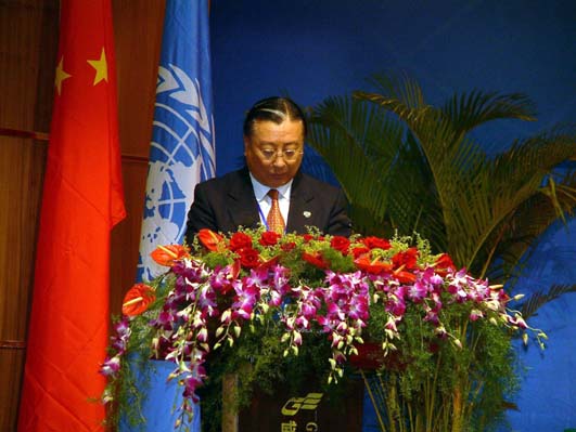 大眾網(wǎng)10月8日威海訊 今天,2004東北亞經(jīng)濟合作論壇在威海隆重開幕。圖為聯(lián)合國副秘書長、亞太經(jīng)濟社會委員會執(zhí)行秘書金學洙在論壇開幕式上致辭。(特派記者 曲濤 報道)