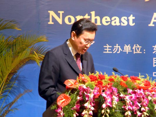 大眾網10月8日威海訊 今天,2004東北亞經濟合作論壇在威海隆重開幕。圖為蒙古國前外交部部長額爾敦楚倫在論壇開幕式上致辭。(特派記者 曲濤 報道) |
