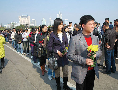在英雄犧牲的次日,眾多市民和網友發起了燭光守靈夜活動。晚上7時不到,擺在橋欄和江堤邊的花圈已經連綿上百米。悼念的人群來了一撥又一撥!盀榱艘粋偉大的靈魂,為了一個我們這個時代需要的靈魂,我就是趕再多路也值得!币晃粚iT從上海趕來守靈的網友說。