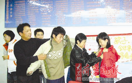 2006年12月,駐濟(jì)某高校教師給貧困生捐贈冬衣。 (本報資料片)