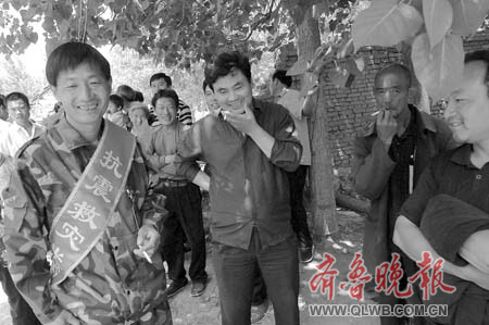 村頭的大樹上掛著“歡迎抗震救災英雄回家”的紅色條幅,全村的父老鄉親都涌了出來,站在小路邊夾道歡迎,十個人一下車,鞭炮聲便響個不停。鄉親們摸摸這個、瞧瞧那個,想看看平日里見慣了的這幾個人是不是突然長了三頭六臂。