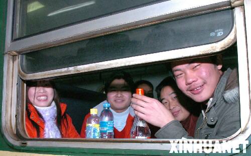 1月31日,幾名乘客登上廣州火車東站開往洛陽的列車后露出笑容。 經鐵路部門全力調度,目前京廣鐵路運輸秩序正逐步恢復。鐵道部支援廣鐵集團的第一批28列列車1月30日已全部上線運行。 新華社記者 壯錦攝