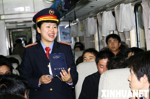 1月31日凌晨,列車長在車廂內向旅客介紹停車時的安全事項。 當日6時許,往返于沈陽和廣州間、因暴風雪晚點近80個小時的T12/T14次列車在經過了6天6夜的艱難旅程后,安全返回沈陽北站。面對幾十年不遇的冰雪災害,沈陽鐵路局沈陽客運段T12/T14次“三八乘務組”的64名女乘務員以頑強的意志和耐心細致的服務克服了列車嚴重超員、食品飲用水缺乏等諸多困難,贏得了旅客的理解和支持,與3000多名旅客一起平安返回家園。 新華社發(李飛攝)