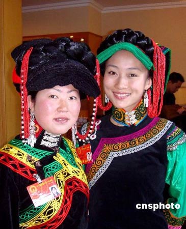 一對彝族“姐妹花”,一個穿紅,一個著綠,一樣甜美的笑臉,她們是赴京參加第十一屆全國人大的四川代表中年紀最小的兩位——一九八0年十二月出生的雅安市石棉縣安順鄉(xiāng)鹿子坪村婦女主任毛金芳和一九八二年四月出生的涼山州歌舞團三級舞蹈演員張蓓蓓。