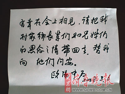 本報記者張洪波和歐陽中石在采訪后合影。 。吃拢度罩形,在政協(xié)委員住地華潤飯店的餐廳里,一位拄著拐杖的老先生和一位白發(fā)蒼蒼的老夫人相伴而來,老夫人拿起筷子,往老先生盤里夾著食物,老先生則安靜地看著妻子——一幅很溫情的畫面。這位老先生就是全國政協(xié)委員、著名書法家歐陽中石。 一同坐下用餐,記者剛說了句自己是山東淄博人,歐陽中石夫婦就一起抬起頭來,有些激動地盯著記者!拔覀兪抢相l(xiāng)啊!”歐陽中石的夫人張茝(音ch□i。┚┖芨吲d地說。記者進一步說明自己是張店人。歐陽中石笑了,說:“張店以前是個鎮(zhèn),還不是區(qū)。” 話題就這樣從彼此熟悉的老家山東聊起。 “對濟南我比你熟,我是濟南人,我在那里生活了20多年。”張茝京說:“我家住在西關,在西門往西,共青團路東頭,那里沒變樣吧?” “黑虎泉的水還噴嗎?”得知齊魯晚報離黑虎泉很近,兩位老人急切地問。聽到記者說“泉還在噴,水很甜,提水的人仍然很多”,兩位老人很是高興。張茝京說:“五龍?zhí)兜乃埠芴穑r侯我們常去那里喝泉水。” “趵突泉的水還噴嗎?”聽到記者肯定的答復后,兩位老人相視一笑,接著又搖了搖頭:“你不知道那幾年泉水干枯的時候,我們心里可著急呢!” “還有百脈泉呢?珍珠泉呢?”接連把濟南的幾大名泉都問了一個遍兒,兩位老人才放下心來!拔覀兘(jīng)常回家,去年12月份剛回去過,不過還是有些放心不下。” 問完了夫人的老家,歐陽中石又把話題轉(zhuǎn)向了他的家鄉(xiāng)——泰安!奥犝f中華文化標志城選址山東,前一陣家鄉(xiāng)人來告訴我這事兒時,我特別高興。文化標志城建在曲阜和鄒城之間,離泰安那么近,幾乎延伸到我家邊上,我既光榮,又有責任。”歐陽中石突然加重語氣說:“你回去幫我告訴他們,只要有需要我的地方,我一定全力以赴!” 非常愉快的午餐時間,就在兩位老人對家鄉(xiāng)的回憶中飛快地過去了。離開時,歐陽老人欣然寫下一段思鄉(xiāng)語,托齊魯晚報轉(zhuǎn)達給他日夜思念的家鄉(xiāng)父老:“有幸在會上相見,請把我對家鄉(xiāng)長輩們和兄姊們的思念之情帶回去,替我向他們問安”。 |