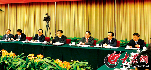 □記者 姜玉泰 張國(guó)棟 報(bào)道 本報(bào)北京3月9日訊 今天上午,中共中央總書(shū)記、國(guó)家主席、中央軍委主席胡錦濤來(lái)到山東代表團(tuán),與代表們一起審議溫家寶總理所作的政府工作報(bào)告和吳邦國(guó)委員長(zhǎng)所作的全國(guó)人大常委會(huì)工作報(bào)告。他希望山東全省廣大干部群眾團(tuán)結(jié)一心、扎實(shí)工作,不斷奪取改革開(kāi)放和全面建設(shè)小康社會(huì)新的更大的勝利。 中共中央政治局委員王岐山,國(guó)務(wù)委員兼國(guó)務(wù)院秘書(shū)長(zhǎng)華建敏參加了審議。中共山東省委書(shū)記、省人大常委會(huì)主任李建國(guó)主持會(huì)議,省委副書(shū)記、省長(zhǎng)姜大明發(fā)言。 胡錦濤認(rèn)真聽(tīng)取了我省代表的發(fā)言,邊聽(tīng)邊記,隨后發(fā)表了重要講話。他說(shuō),過(guò)去的五年,山東同全國(guó)一樣,各項(xiàng)事業(yè)發(fā)展取得了可喜成績(jī),改革開(kāi)放繼續(xù)深化,經(jīng)濟(jì)平穩(wěn)快速發(fā)展,經(jīng)濟(jì)效益不斷提高,社會(huì)事業(yè)扎實(shí)推進(jìn),社會(huì)主義民主法制建設(shè)、精神文明建設(shè)和黨的建設(shè)也取得了新的進(jìn)展。這些成績(jī)的取得,是山東省委和省政府認(rèn)真貫徹落實(shí)中央的方針政策、團(tuán)結(jié)帶領(lǐng)全省廣大干部群眾努力奮斗的結(jié)果。今年是全面貫徹落實(shí)黨的十七大作出的戰(zhàn)略部署的第一年,是實(shí)施“十一五”規(guī)劃承上啟下的一年,做好今年的工作意義重大。他希望山東的同志全面貫徹黨的十七大精神,高舉中國(guó)特色社會(huì)主義偉大旗幟,以鄧小平理論和“三個(gè)代表”重要思想為指導(dǎo),深入貫徹落實(shí)科學(xué)發(fā)展觀,堅(jiān)持把中央的方針政策與山東的實(shí)際緊密結(jié)合起來(lái),進(jìn)一步把握發(fā)展規(guī)律、創(chuàng)新發(fā)展理念、轉(zhuǎn)變發(fā)展方式、破解發(fā)展難題,乘勢(shì)而上,銳意進(jìn)取,不斷奪取全面建設(shè)小康社會(huì)新勝利。 胡錦濤強(qiáng)調(diào),要加快轉(zhuǎn)變經(jīng)濟(jì)發(fā)展方式,促進(jìn)經(jīng)濟(jì)又好又快發(fā)展。黨的十七大在總結(jié)改革開(kāi)放以來(lái)經(jīng)濟(jì)發(fā)展經(jīng)驗(yàn)的基礎(chǔ)上,把加快轉(zhuǎn)變經(jīng)濟(jì)發(fā)展方式確定為關(guān)系國(guó)民經(jīng)濟(jì)全局緊迫而重大的戰(zhàn)略任務(wù)。要把這項(xiàng)戰(zhàn)略任務(wù)落到實(shí)處,實(shí)現(xiàn)經(jīng)濟(jì)又好又快發(fā)展,關(guān)鍵是要大力促進(jìn)“三個(gè)轉(zhuǎn)變”,即促進(jìn)經(jīng)濟(jì)增長(zhǎng)由主要依靠投資、出口拉動(dòng)向依靠消費(fèi)、投資、出口協(xié)調(diào)拉動(dòng)轉(zhuǎn)變,由主要依靠第二產(chǎn)業(yè)帶動(dòng)向依靠第一、第二、第三產(chǎn)業(yè)協(xié)同帶動(dòng)轉(zhuǎn)變,由主要依靠增加物質(zhì)資源消耗向主要依靠科技進(jìn)步、勞動(dòng)者素質(zhì)提高、管理創(chuàng)新轉(zhuǎn)變。一是要著力推進(jìn)自主創(chuàng)新。山東要實(shí)現(xiàn)由經(jīng)濟(jì)大省向經(jīng)濟(jì)強(qiáng)省的跨越,必須堅(jiān)持走中國(guó)特色自主創(chuàng)新道路,把增強(qiáng)自主創(chuàng)新能力作為轉(zhuǎn)變經(jīng)濟(jì)發(fā)展方式的中心環(huán)節(jié),大力推進(jìn)原始創(chuàng)新、集成創(chuàng)新和引進(jìn)消化吸收再創(chuàng)新。二是要著力推動(dòng)經(jīng)濟(jì)結(jié)構(gòu)調(diào)整和促進(jìn)產(chǎn)業(yè)結(jié)構(gòu)優(yōu)化升級(jí)。要堅(jiān)持走中國(guó)特色新型工業(yè)化道路,加強(qiáng)第一產(chǎn)業(yè),提升第二產(chǎn)業(yè),做大第三產(chǎn)業(yè),努力構(gòu)建現(xiàn)代產(chǎn)業(yè)體系。要大力推進(jìn)信息化與工業(yè)化融合,加快改造提升傳統(tǒng)產(chǎn)業(yè),加快發(fā)展先進(jìn)裝備制造業(yè),加快發(fā)展高新技術(shù)產(chǎn)業(yè),加快發(fā)展金融、信息、旅游等服務(wù)業(yè),推動(dòng)生產(chǎn)要素向優(yōu)勢(shì)產(chǎn)業(yè)和企業(yè)集中,提高產(chǎn)業(yè)集中度和競(jìng)爭(zhēng)力。三是要著力擴(kuò)大消費(fèi)需求、改善民生。要實(shí)現(xiàn)我國(guó)經(jīng)濟(jì)持續(xù)增長(zhǎng),必須依靠消費(fèi)、投資、出口三管齊下。要堅(jiān)持以人為本,把擴(kuò)大內(nèi)需與改善民生更好地結(jié)合起來(lái),不斷解決好人民最關(guān)心、最直接、最現(xiàn)實(shí)的利益問(wèn)題,讓全體人民共享改革發(fā)展成果。 胡錦濤指出,要走中國(guó)特色農(nóng)業(yè)現(xiàn)代化道路,推進(jìn)社會(huì)主義新農(nóng)村建設(shè)。山東是農(nóng)業(yè)大省,農(nóng)業(yè)和農(nóng)村發(fā)展?jié)摿艽,一定要按照黨的十七大提出的要求,采取有效措施,切實(shí)把建設(shè)社會(huì)主義新農(nóng)村各項(xiàng)任務(wù)落到實(shí)處,不斷開(kāi)創(chuàng)農(nóng)業(yè)和農(nóng)村工作的新局面。要抓好農(nóng)業(yè)基礎(chǔ)建設(shè),按照形成城鄉(xiāng)經(jīng)濟(jì)社會(huì)一體化新格局的要求,加大統(tǒng)籌城鄉(xiāng)發(fā)展力度,鞏固完善強(qiáng)化支農(nóng)惠農(nóng)政策,大幅度增加農(nóng)業(yè)和農(nóng)村投入,下大氣力把農(nóng)業(yè)基礎(chǔ)夯實(shí)打牢。