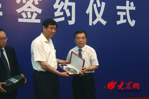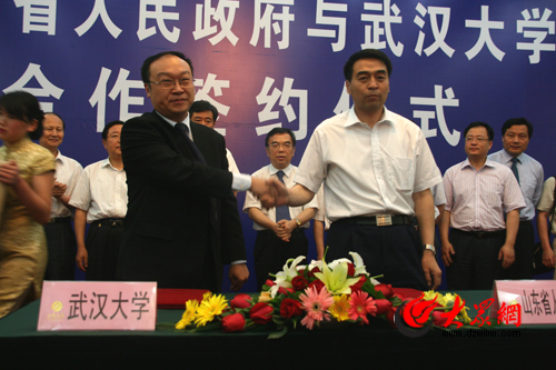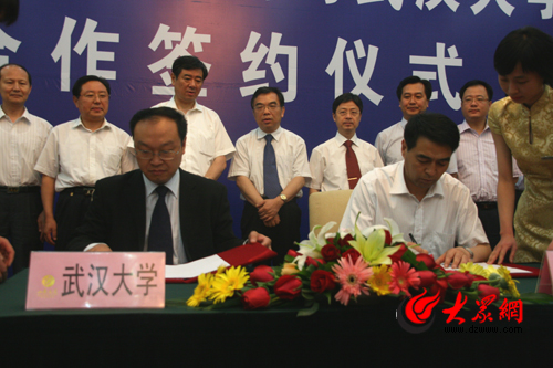 山東省經貿委主任郭述禹、武漢大學副校長謝紅星代表雙方簽約