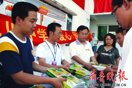 本報(bào)綿陽6月9日訊9日,本報(bào)“愛心圖書文具送災(zāi)區(qū)”活動(dòng)第二站來到綿陽,將價(jià)值40萬元的圖書文具送到北川中學(xué)以及石馬鎮(zhèn)幼兒園、小學(xué)、中學(xué),并決定在石馬鎮(zhèn)設(shè)立一所“齊魯晚報(bào)愛心圖書館”。 9日下午4點(diǎn)多,本報(bào)“愛心圖書文具送災(zāi)區(qū)”活動(dòng)來到綿陽市北川中學(xué)臨時(shí)教學(xué)點(diǎn),根據(jù)學(xué)校提供的書單,本報(bào)聯(lián)合世紀(jì)金榜書業(yè)有限公司把精心準(zhǔn)備的17萬元教輔書,贈(zèng)送給該校初一至高三的1000多名學(xué)生,這些教輔書涵蓋了各個(gè)學(xué)科。 北川中學(xué)的學(xué)生告訴記者,自己的書本都被埋在了廢墟下。本報(bào)和世紀(jì)金榜送來的這些輔導(dǎo)書正是他們急需的。世紀(jì)金榜常務(wù)副總袁立新介紹,為了盡快讓孩子們拿到圖書,他們想方設(shè)法加快運(yùn)送,終于比原計(jì)劃提前三天將圖書運(yùn)達(dá)。 北川中學(xué)的捐贈(zèng)結(jié)束后,晚6點(diǎn)半,愛心送書車又趕到綿陽市游仙區(qū)石馬鎮(zhèn),該鎮(zhèn)在地震中受災(zāi)嚴(yán)重。鎮(zhèn)上的幼兒園、小學(xué)、中學(xué)集中在一處,共有2000多名孩子。本報(bào)向這里的孩子們捐贈(zèng)了價(jià)值20余萬元的圖書、文具,此外還有幾十臺(tái)兒童識字電腦、科普DVD光盤等教學(xué)用具。 根據(jù)石馬鎮(zhèn)學(xué)校的情況,本報(bào)和學(xué)校決定把這些愛心圖書聚集起來,設(shè)立一所“齊魯晚報(bào)愛心圖書館”,讓愛心圖書能夠物盡其用,讓每位孩子都能看到喜歡的課外讀物。
