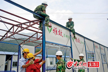 5月27日,在四川省北川縣擂鼓鎮(zhèn)勝利村,濟(jì)南援建的活動(dòng)板房正在搭建中。截至27日,我省的1200多套活動(dòng)板房已運(yùn)抵北川縣,來(lái)自濟(jì)南、青島、淄博等地的340多名工作人員已進(jìn)入現(xiàn)場(chǎng)展開(kāi)施工。用不了多久,當(dāng)?shù)氐氖転?zāi)群眾就能搬進(jìn)像樣的安置房了。 特派記者 任鵬 攝影報(bào)道 |