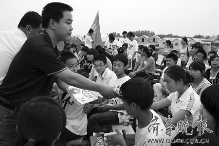 由于教學(xué)樓都已成了危房,德陽市內(nèi)所有的中小學(xué)臨時放假,而在綿竹市體育場臨時安置點(diǎn)有一所愛心帳篷學(xué)校,在這里,志愿者、老師帶著120多名孩子還在堅持上課。