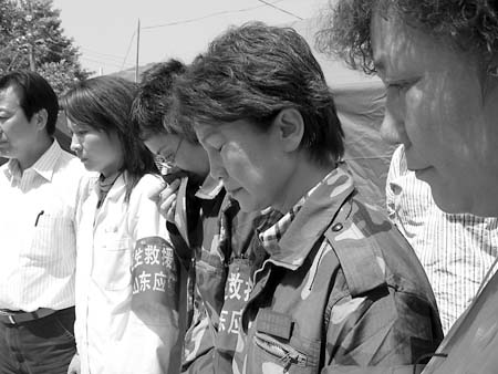 在山東醫療隊落腳的青川縣武裝部院內,山東衛生支援四川災區指揮部總指揮康永軍和十幾位醫療隊員集體脫帽,為大地震遇難者默哀(右圖)。青川中醫院的醫護人員和被安置在此的受災群眾也都自覺站立默哀。來自上海急救中心的救護車隊也打開了警報,向逝者志哀。