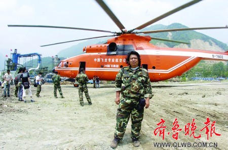 這是我在北川縣擂鼓鎮采訪米-26直升機吊運挖掘機到唐家山堰塞湖時的留影,也是我此行最難的一次拍攝。