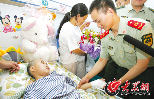 5月28日,濟南消防支隊參加四川地震災區映秀搶險救援的官兵來到濟南中心醫院,看望他們救出的女孩尚婷。
