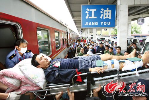 □記者 李勇 報(bào)道 本報(bào)綿陽5月21日訊 今天中午,隨著一位雙下肢骨折的傷員被抬上山東急救救援車隊(duì)的救護(hù)車,災(zāi)區(qū)規(guī)模最大的一次傷員轉(zhuǎn)運(yùn)活動(dòng)開始,300名傷員將被送往昆明繼續(xù)治療。 上午9點(diǎn),包括山東救援車隊(duì)28輛救護(hù)車在內(nèi)的100多輛救護(hù)車在江油市集結(jié)。中午12點(diǎn),急救車開始在江油幾個(gè)傷員集中收治的醫(yī)院裝載傷員,之后駛往江油火車站。此時(shí),來自昆明幾家收治醫(yī)院的137名醫(yī)護(hù)人員也已在火車站集結(jié),他們的任務(wù)是途中護(hù)送傷員。 下午2時(shí),在當(dāng)?shù)伛v軍戰(zhàn)士、公安、乘務(wù)員和志愿者的努力下,300名傷員順利登上專列,無一名傷員發(fā)生意外。