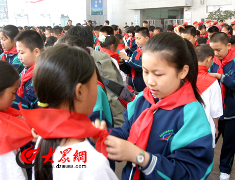 濟(jì)南市的小學(xué)生為四川小伙伴戴上鮮艷的紅領(lǐng)巾