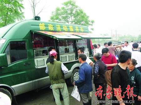 25日下午2時,一輛綠色郵政車開進了北川縣擂鼓鎮,與普通郵車不同的是,這輛郵政車是一座活動的郵局,車子的左側開有四個窗口,所有在郵局辦理的郵政業務全部在這輛車上辦理,電子郵局與全國各地郵局都實現了網絡互聯。這輛車剛開進鎮,就引來了眾人的圍觀(下圖)。
