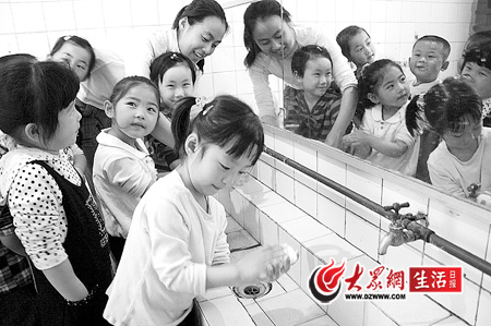 6日,在濰坊市市區天昱幼兒園內,孩子們正在老師的指導下正確洗手。