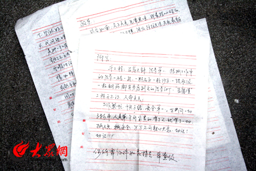 大眾網北川1月23日訊 (大眾網特派記者 曲濤)詩云:烽火連三月,家書抵萬金。今天:地震援建處,家書感人心。在淄博援建點北川縣香泉小學施工現場,記者見到了年邁父親寫給援建施工現場兒子的一封家書,堪抵萬金。