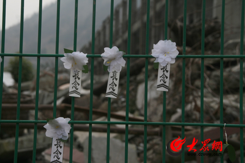 北川中學柵欄上哀念的小白花