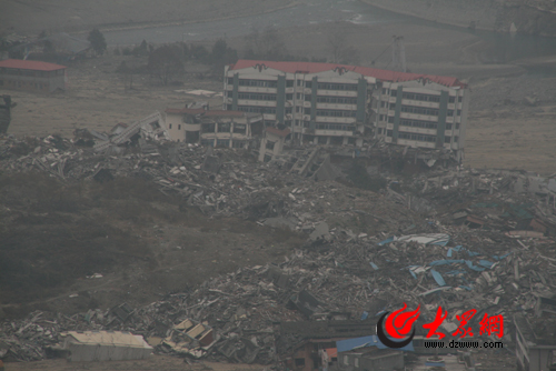 1月22日下午,本網(wǎng)志愿服務(wù)隊步行沿著被地震中垮塌滾落的巨石砸的坑坑洼洼的水泥路,登上北川臨近小山頭,俯瞰整個在地震中顛覆的北川老縣城。廢墟猶在,蒼茫的薄霧籠罩在山谷,眼前的景象難以想象當(dāng)初這個全國唯一羌族自治縣曾經(jīng)的秀美。整個北川縣城處在兩座大山中間,地震時,兩側(cè)山體垮塌下來的土石掩埋了大片縣城,用當(dāng)?shù)厝说脑捳f“縣城被‘包了餃子’”,一些地方完全見不到人類曾經(jīng)活動的痕跡。縣城中心東倒西歪的建筑,斷壁殘垣的民宅,半掩埋在泥沙中的大樓,構(gòu)成了整個北川縣城的主體景象。