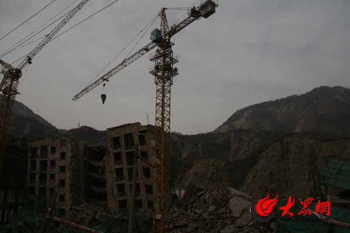 縣城已沒有完整的建筑,坍塌成一堆水泥廢墟樓房遍地比比皆是,許多沒有傾倒的大樓也是東倒西扭,五層變三層,一樓變地下室,城中原本筆直的大橋震成了波浪狀,山谷一側大山坍塌的土石沖進縣城掩埋了老城區,另一側滾落的巨石則砸碎了建筑和道路,大自然的力量讓記者一行人深深敬畏。