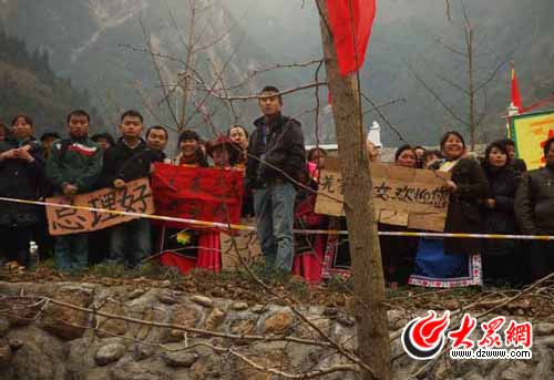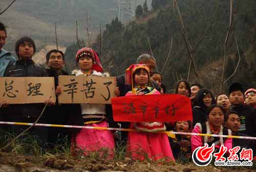 大眾網北川訊 (特派記者 曲濤 陳宏發)1月24日,溫家寶總理來到吉娜羌寨,當地群眾自發制作標語歡迎溫總理。