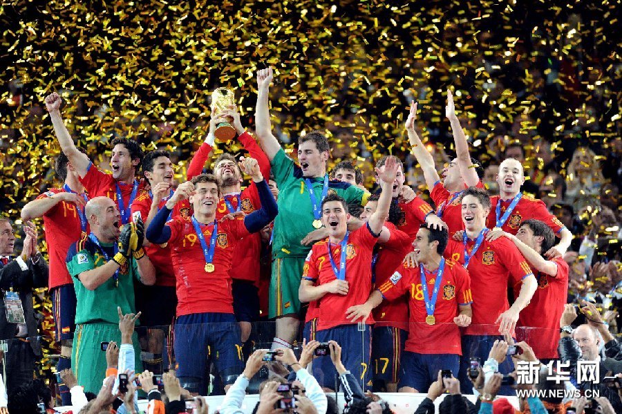 7月11日,西班牙隊球員在領(lǐng)獎臺上高舉大力神杯慶祝。當日,在約翰內(nèi)斯堡足球城體育場舉行的2010年南非世界杯決賽中,西班牙隊以1比0戰(zhàn)勝荷蘭隊,獲得冠軍。新華社記者郭勇攝
