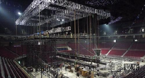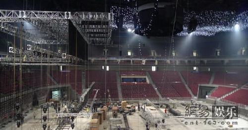 五棵松體育館內(nèi)工作人員還在為舞臺忙碌。
