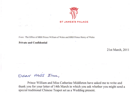 回信中寫道(譯文大意):朱小姐,威廉王子和米德爾頓小姐囑咐我寫信給您致以謝意,感謝您于3月14日來信表示您可能會制作一套特別的具有中國傳統(tǒng)特色的茶具作為結(jié)婚賀禮。
