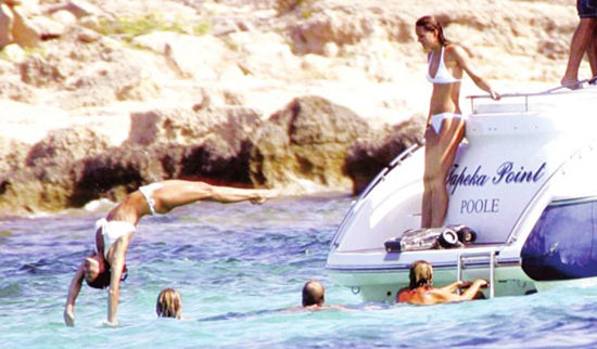 皮帕姿態優雅地向后跳水。按英國《每日郵報》說法,威廉王子像其他年輕男子一樣,也表演起向后跳水,“取悅”凱特。不過,他似乎沒有掌握要領,肚子先著水。