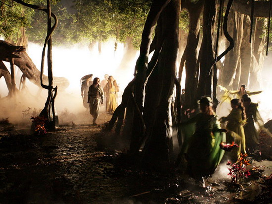 榕 樹 林 絕美程度:★★★★☆ 經典劇情: 小龍女不認楊過、楊過大戰魚網陣等 榕樹林里的美只有在夜晚你才能感受到, 而多場在絕情谷里的重頭戲,諸如小龍女不認楊過,都是在這里拍攝的夜戲,加上夢境般的燈光,鮮艷的情花配上水霧,這里確實是一個可以讓人忘憂忘情的地方。這個占地一千平米左右的榕樹林,遠遠一看與真樹無異,只是較之四周有些凋落的植被相比,就顯得有些過青嫩了些。原來這一片枝繁葉茂,盤根錯結的榕樹林皆是由水泥澆鑄而成,樹皮紋路都做的栩栩如生,于敏導演表示連拍特寫也不會擔心穿幫。榕樹林下便是鮮艷欲滴的情花叢,霧氣管“埋伏”其中,不時的有水霧產生。 背后的故事: 榕樹林很美,但也因為霧氣里的水氣,讓新建的榕樹林總是泥濘不堪,而拍攝榕樹林戲份時正是浙江象山的梅雨時間,演員們總是帶著滿身泥結束每天的拍攝,而一身白衣的“小龍女”更被工作人員叫上了“小泥女”的外號。榕樹林里的拍攝也是黃曉明映象最為深刻的,不僅因為“楊過”很多大情大性的戲份在這里拍攝,表演上精力耗費不少,還得有著很強的體魄,有一場戲黃曉明就在“榕樹林”里連續拍了半個月的大夜(即通宵),文戲拍完拍武戲部分,不僅被威亞吊著每天飛來飛去,在泥濘的情花叢里還需不斷的穿梭,“姑姑”不認他時,更是在泥濘的地面上一次次的爬行,可以說是苦不堪言。