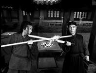 制作說明:為營造這種“意念中”的效果,原來的彩色背景被轉(zhuǎn)變成了黑白的,同時(shí)為了說明這并不是真實(shí)的決斗,他們兩人的武器都加上了閃光效果。