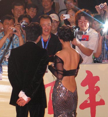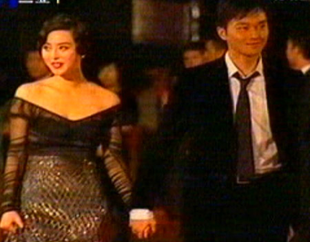 香港明星張智霖與內地影人范冰冰手牽手踏上紅地毯,還不時向歡呼的群眾揮手。張智霖的領帶系得很松,顯示出別樣的瀟灑。而范冰冰身著低胸晚裝亮相,性感迷人。