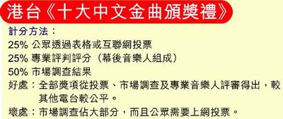 據香港媒體報道,樂壇頒獎禮雖然與歌手沒有直接的利益關系,但各大唱片公司每年都為旗下的歌手極力爭取各樣獎項,原來背后涉及唱片公司的龐大利益關系。雖然歌手在頒獎禮中奪獎是不會為他帶來直接利益,卻會令歌手人氣急升,奠定其在樂壇地位,尤其是成功贏得“最受歡迎男歌手”及“最受歡迎女歌手”等獎項的人,其樂壇天王、天后地位、身價更是毋庸置疑。
