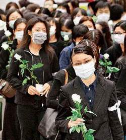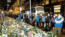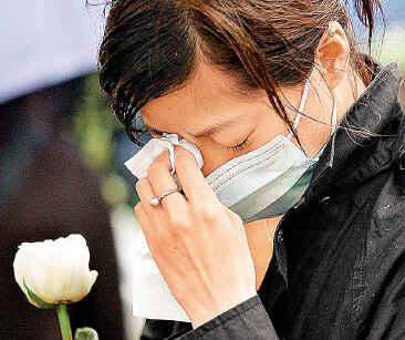 ![]() 點擊此處查看專題其它圖片 ![]() ![]() ![]() 據(jù)香港媒體報道,一代巨星殞落,藝人張國榮今日出殯,昨日在香港殯儀館設靈公祭,午后下起綿綿細雨,似乎要為他的去世多添一點哀愁。估計有逾萬中外歌迷前往殯儀館及文華酒店致祭,花圈亦擺滿殯儀館內(nèi)外,而張的生前親友及藝人陸續(xù)前往致祭,其至愛唐鶴德(唐唐)及前經(jīng)理人陳淑芬則早已抵達打點一切,遺體今日進行火化。 已故巨星張國榮設靈于香港殯儀館,靈堂頗為簡潔,既沒有傳統(tǒng)的挽聯(lián)、橫額等,在 正中央擺設有張國榮于電影《金枝玉葉》的劇照,相片則圍上白玫瑰,遺照前面放有兩支白蠟燭,靈堂并無擺放祭品,而至親好友的花圈則放在靈堂的前方及兩側。靈堂左右放有兩臺大電視,不斷播放張國榮生前的MTV。 張的摯友唐鶴德及前女經(jīng)理人陳淑芬的心形花圈,分設于靈堂的正前方。唐的花圈寫有“天長地久有時盡、此愛綿綿無絕期”,而陳的花圈則寫上“共同渡過、風繼續(xù)吹”。 此外,曾盛傳與“哥哥”有戀情的助手Kenneth亦有送花圈,上面寫有“絕代芳華的老板、永遠是我的小明星”。 身穿黑西裝的“唐唐”,昨午二時與陳淑芬及其他親友,如張的長姊及姊夫麥法誠等已抵達殯儀館,他顯得神情哀傷,雙眼紅腫,大有欲哭無淚的感覺,在整個晚上,唐則不停抹眼淚,令旁人亦替他心酸。在昨午五時許,約五十名記者獲安排在靈堂向張致祭,但家屬嚴格規(guī)定不準拍照,所有攝影器材均要留在外面。而唐與張的胞姊張綠萍均在主家席位鞠躬回禮。 昨日中午左右,已有歌迷到達殯儀館對開的一個球場等候進入靈堂致祭,人龍一度延伸至東隧附近,中外籍歌迷數(shù)以千計,其中五千多人可進入靈堂致祭,其余歌迷只能在殯儀館外遙祭。家屬亦提前半小時于下午五時半,讓歌迷分批入內(nèi),每次五十人,但同樣規(guī)定不準拍照。而一名女歌迷一度在靈堂內(nèi),偷偷取出相機準備拍照,卻被發(fā)現(xiàn)而被“請走”。 張國榮的家屬昨日預備了大批吉儀,以及一本紀念小冊,在場派發(fā)予致祭人士,吉儀上印有“復活在我,生命也在我,信我的人,雖然死了,也必復活。”內(nèi)附一元硬幣。及至晚上九時許,因致祭人士估計逾萬人,保安人員從外運來兩大袋一元硬幣,用作吉儀之用。 雖然警方昨日派出大批人員到場維持秩序,但發(fā)言人則表示會留意現(xiàn)場情況,卻不會有特別的安排。而家屬亦雇有約百名身穿制服的保安員在殯儀館內(nèi)外維持秩序。 張國榮的其中一名胞姊,昨夜離去時,在殯儀館外已傷心過度,一度暈倒,由在場保安員抱上的士離開。 |