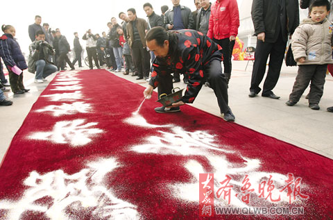 53歲的魏翌海是聊城有名的沙書大師,經(jīng)過30多年努力,他的沙書已形成了自己的特色,豪放大氣,筆鋒流暢,立體感強(qiáng)。他用一定比例的鹽和玉米糝兒配成“沙”,使得寫出來的字層次分明。看到齊魯晚報答謝讀者行活動要來聊城的消息,他非常激動,24日早上6點半,他就來到了水城明珠劇場廣場,提前做準(zhǔn)備活動,以為齊魯晚報答謝讀者行活動助興。