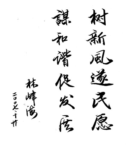 在慶祝齊魯晚報(bào)創(chuàng)刊20周年之際,聊城市市長(zhǎng)林峰海為本報(bào)題詞:“樹(shù)新風(fēng)遂民愿 謀和諧促發(fā)展”。