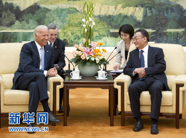 8月18日,中國全國人大常委會委員長吳邦國在北京人民大會堂會見美國副總統拜登。 新華社記者黃敬文攝