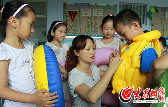 大眾網德州訊(通訊員 高向陽)為了扎實做好學生暑假的安全工作,增強學生的防溺水安全意識,提高學生的自救互救技能,,德州市實驗小學利用放暑假前的時間開展了以“預防溺水,珍愛生命”為主題的班隊活動。在班隊會上,該校各班主任結合最近新聞媒體報道的學生溺水死亡的典型事例進行了警示和教育,師生們共同學習了預防溺水的相關事項。學校還通過安全教育課、校園廣播、板報、安全漫畫展等多種形式對學生進行汛期、雨季等安全教育,提高了學生的安全意識。圖為教師在給學生講解救生衣的作用。