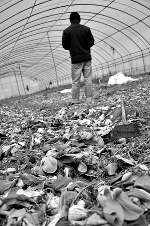 昨日,北京大興區一蔬菜大棚內,由于油菜價格過低,長成的油菜已被鏟掉。