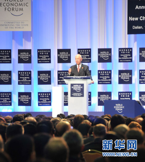世界經濟論壇2011年新領軍者年會(又稱“2011夏季達沃斯論壇”)于9月14日在遼寧省大連市開幕,圖為論壇主席施瓦布致辭。新華網 郭毅 攝