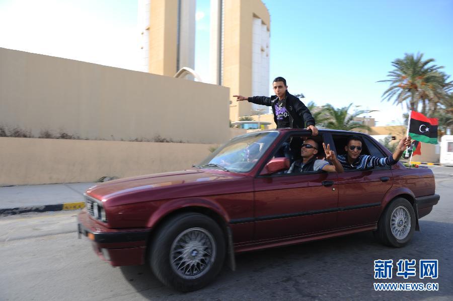 10月20日,在利比亞的黎波里,人們?cè)诼?tīng)聞卡扎菲已傷重身亡后的消息后游行慶祝。利比亞“全國(guó)過(guò)渡委員會(huì)”執(zhí)行委員會(huì)主席賈布里勒20日在新聞發(fā)布會(huì)上證實(shí),卡扎菲當(dāng)天在蘇爾特身亡。新華社記者李木子攝