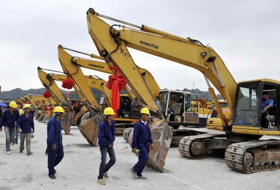 圖① 10月25日,幾名工人從廣州蘿崗中心城區保障性住房項目開工儀式現場的幾臺挖掘機旁走過。