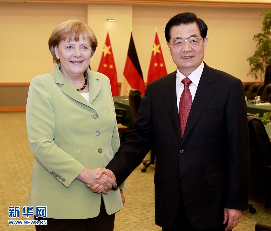 6月18日,國家主席胡錦濤在墨西哥洛斯卡沃斯會見德國總理默克爾。 新華社記者丁林攝
