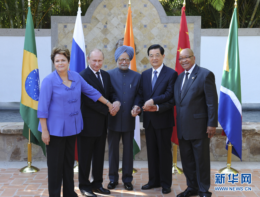 6月18日,中國國家主席胡錦濤在墨西哥洛斯卡沃斯出席金磚國家領導人會晤。這是胡錦濤主席同巴西總統羅塞夫、俄羅斯總統普京、印度總理辛格、南非總統祖馬合影。新華社記者馬占成攝